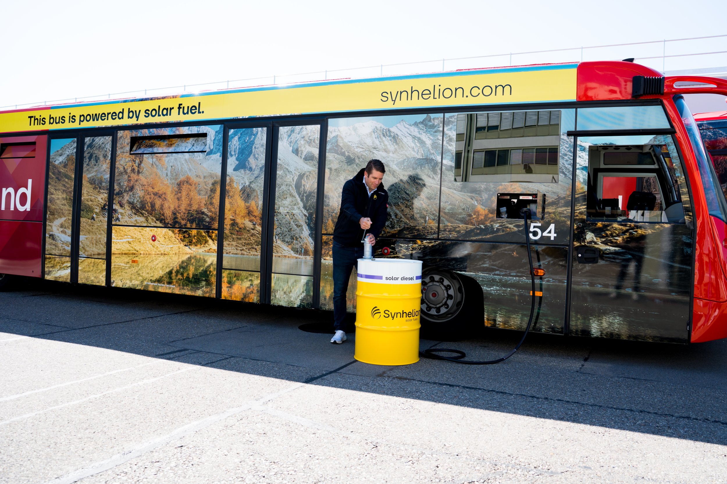 Philipp Furler, Co-CEO and Co-Founder of Synhelion, fuels a passenger shuttle bus with renewable synthetic diesel at Zurich Airport. Source: Synhelion