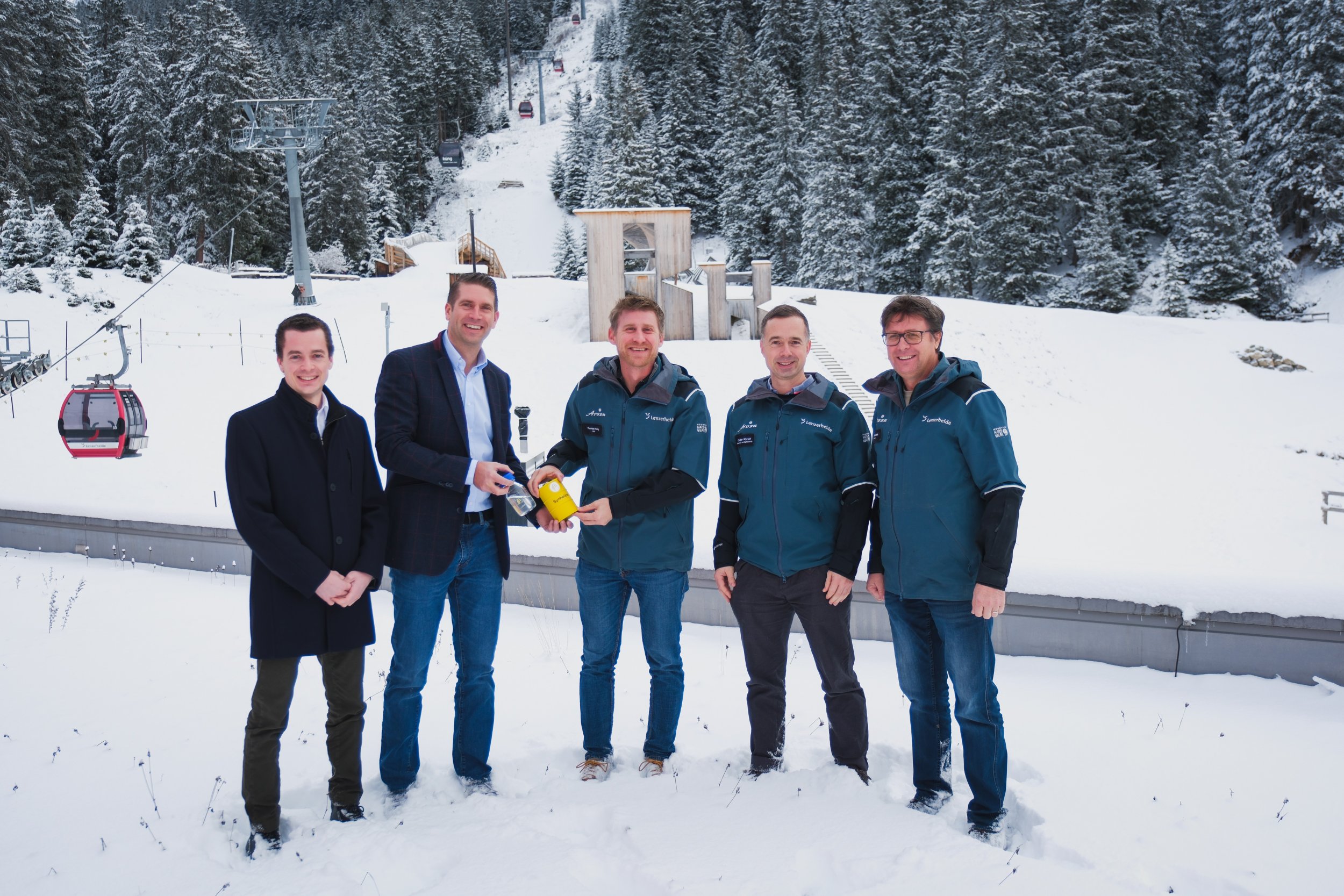 Lenzerheide Bergbahnen AG and Synhelion sign a long-term offtake agreement for renewable diesel to power snow groomers at the Arosa Lenzerheide ski resort. (Pictured from left to right: Andreas Rübel, Business Development Manager at Synhelion, Philipp Furler, Co-CEO and Co-Founder of Synhelion, Thomas Küng, CEO of Lenzerheide Bergbahnen AG, Christian Wyrsch, Head of Sales and Digitalization at Lenzerheide Bergbahnen AG, and Othmar Kurath, Head of Lift Operations at Lenzerheide Bergbahnen AG. Source: Lenzerheide Bergbahnen AG.